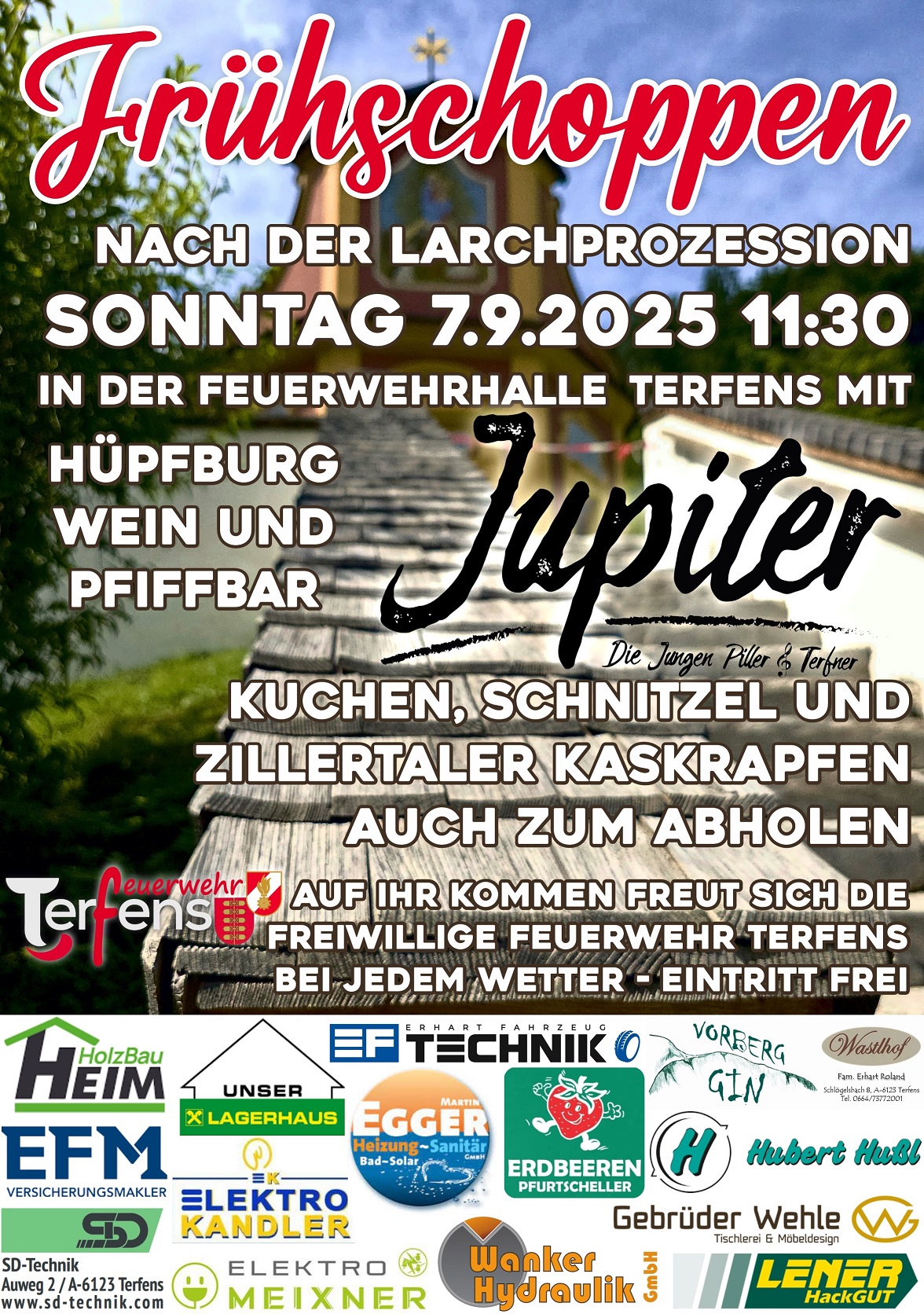 Das Highlight zum Sommerschluss steht wieder bevor! 🌞 Unser legendärer Frühschoppen findet wieder am Sonntag den 7. September 2025 statt. Bei jedem Wetter, entweder nach der Larch Prozession um ca. 11:30, oder bei Schlechtwetter nach der Messe um ca. 10 Uhr. Diesmal musikalisch umrandet von Jupiter, die Jungen Piller & Terfner.